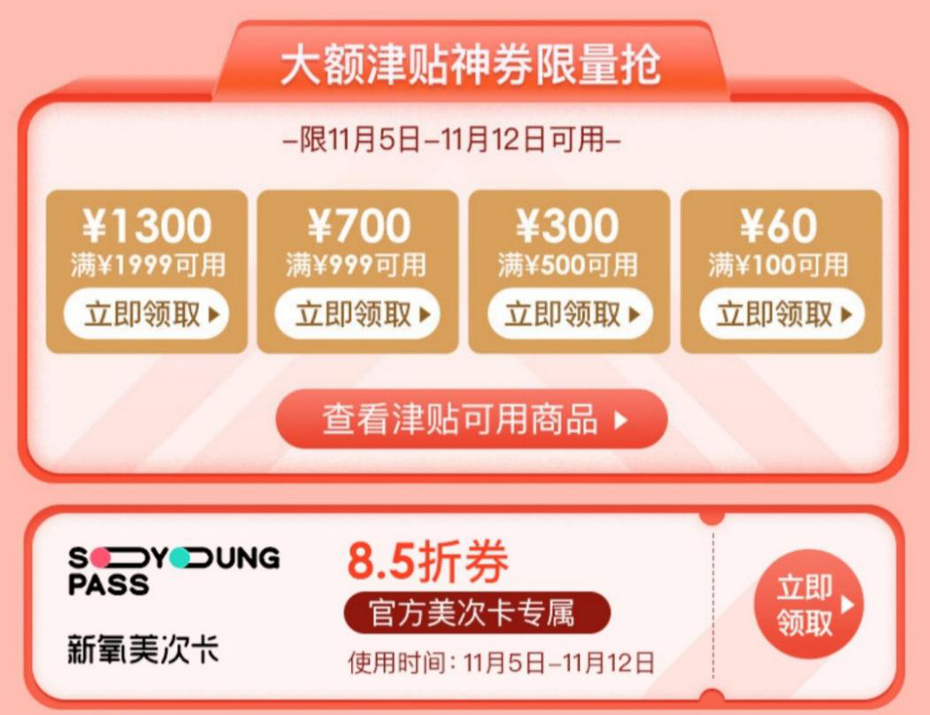 11月5日至12日,新氧更為求美者準(zhǔn)備了5折閃GO、低到5折等鉅惠。同一時段,求美者此前在“11.11醫(yī)美狂歡節(jié)”主題頁領(lǐng)取的滿1999減1300、滿999減700、滿500減300、滿100減60等大額津貼,以及新氧美次卡8.5折券,均可使用。?